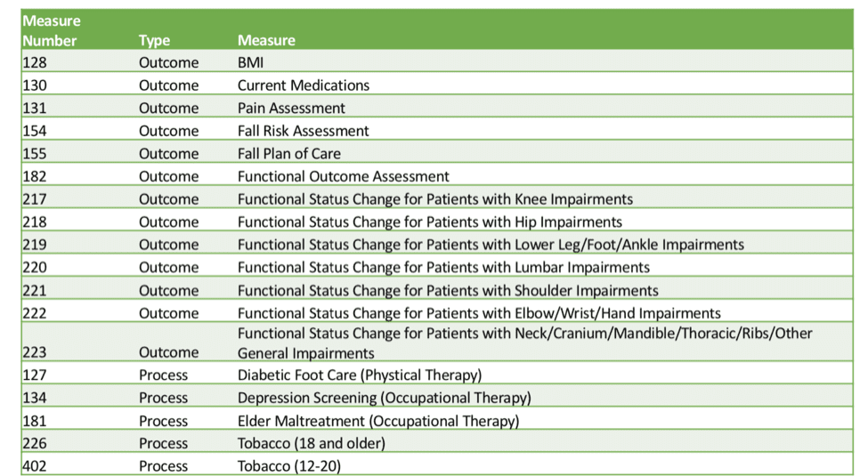 The list below is a pared down list of recommended quality measures geared to the Physical Therapists and all of them are available through Patient360. These should look familiar for those of you who participated in PQRS – and all of these measures are included in the Practice Perfect & Patient360 Integration making it easy for you to report to the Patient360 registry and review your MIPS performance.