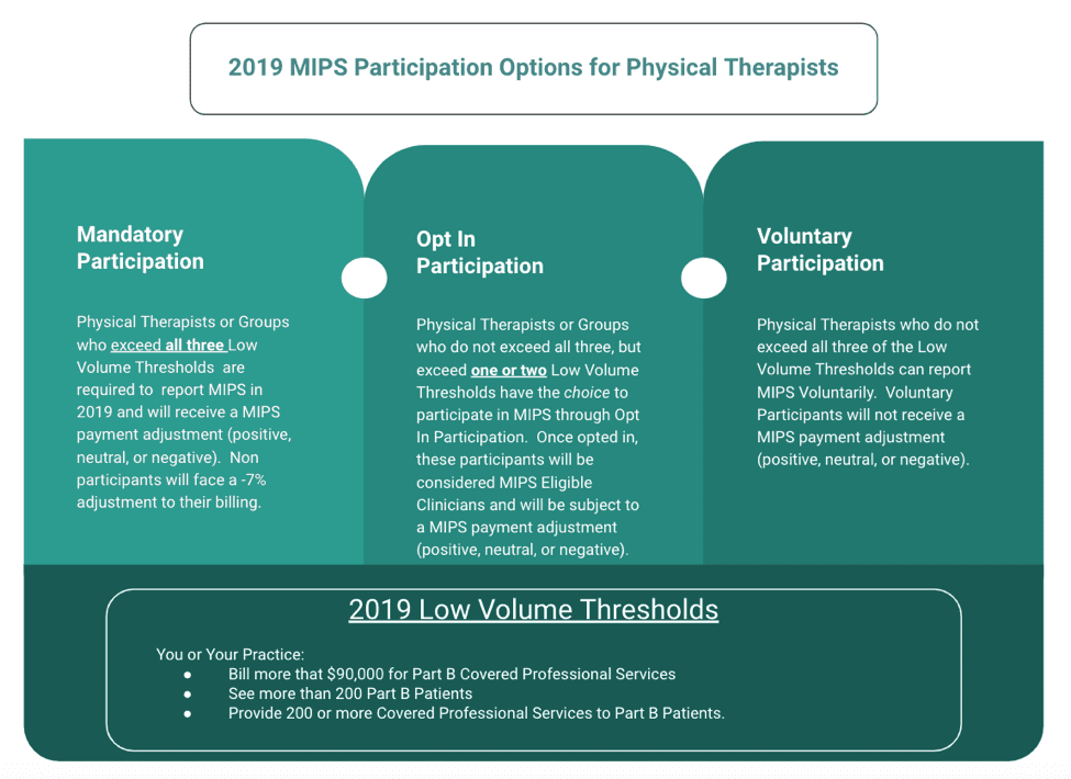 First of all, although PTs are new MIPS Eligible Clinician Types in 2019, MIPS reporting eligibility really comes down to Low Volume Thresholds (LVTs).