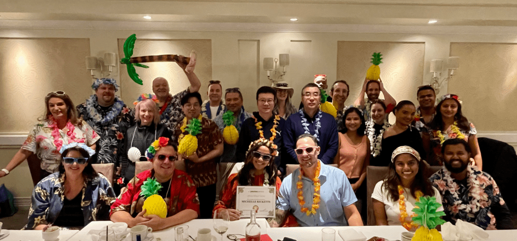 And if you’re wondering why we’re wearing sunglasses and surrounded by palm trees, pineapples, and leis, that’s because this year’s Holiday Party theme was Christmas in Hawaii. 🌴🎅☀️